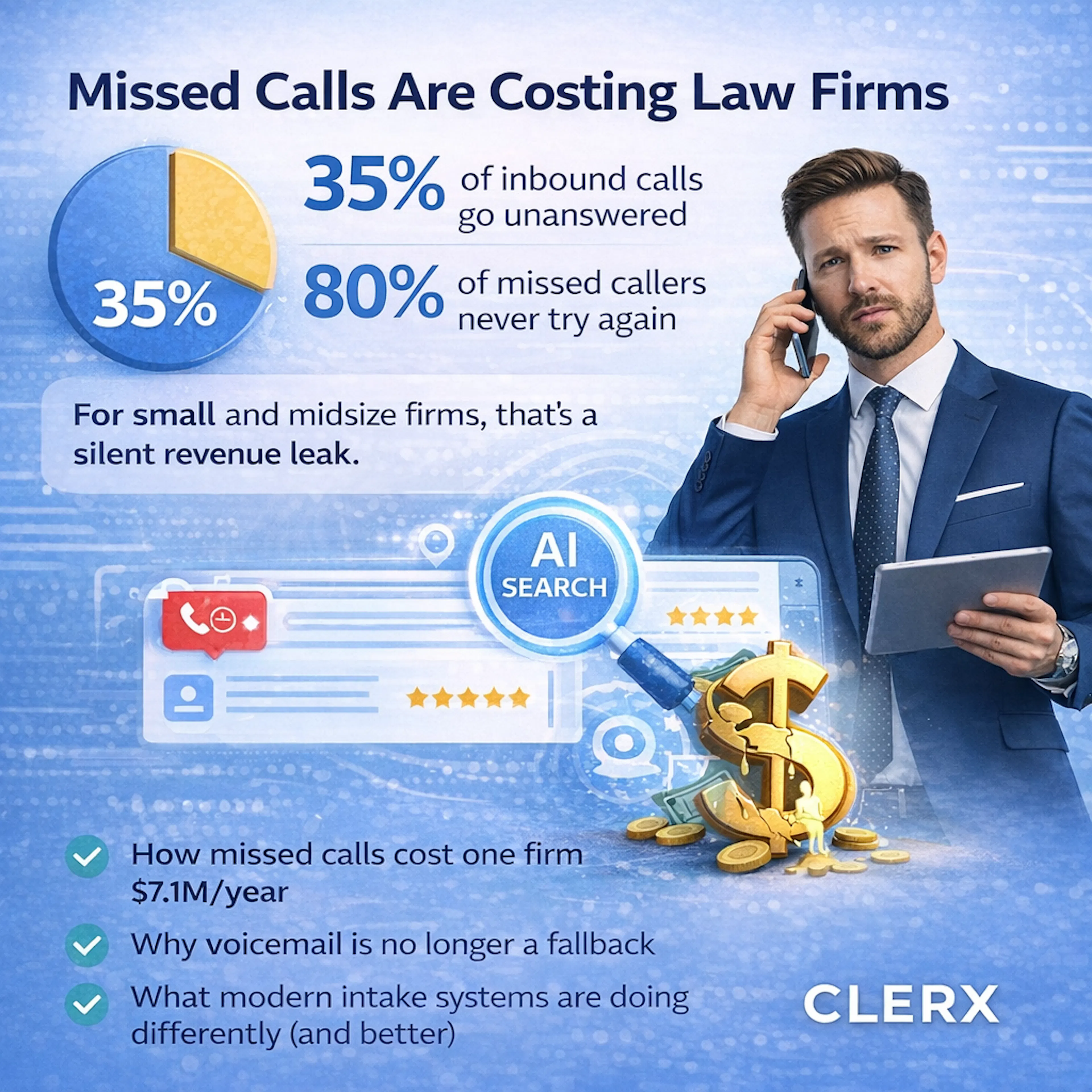 For many firms, especially in competitive consumer-facing practice areas, the intake breakdown caused by missed calls can quietly cost hundreds of thousands or even millions of dollars over time.